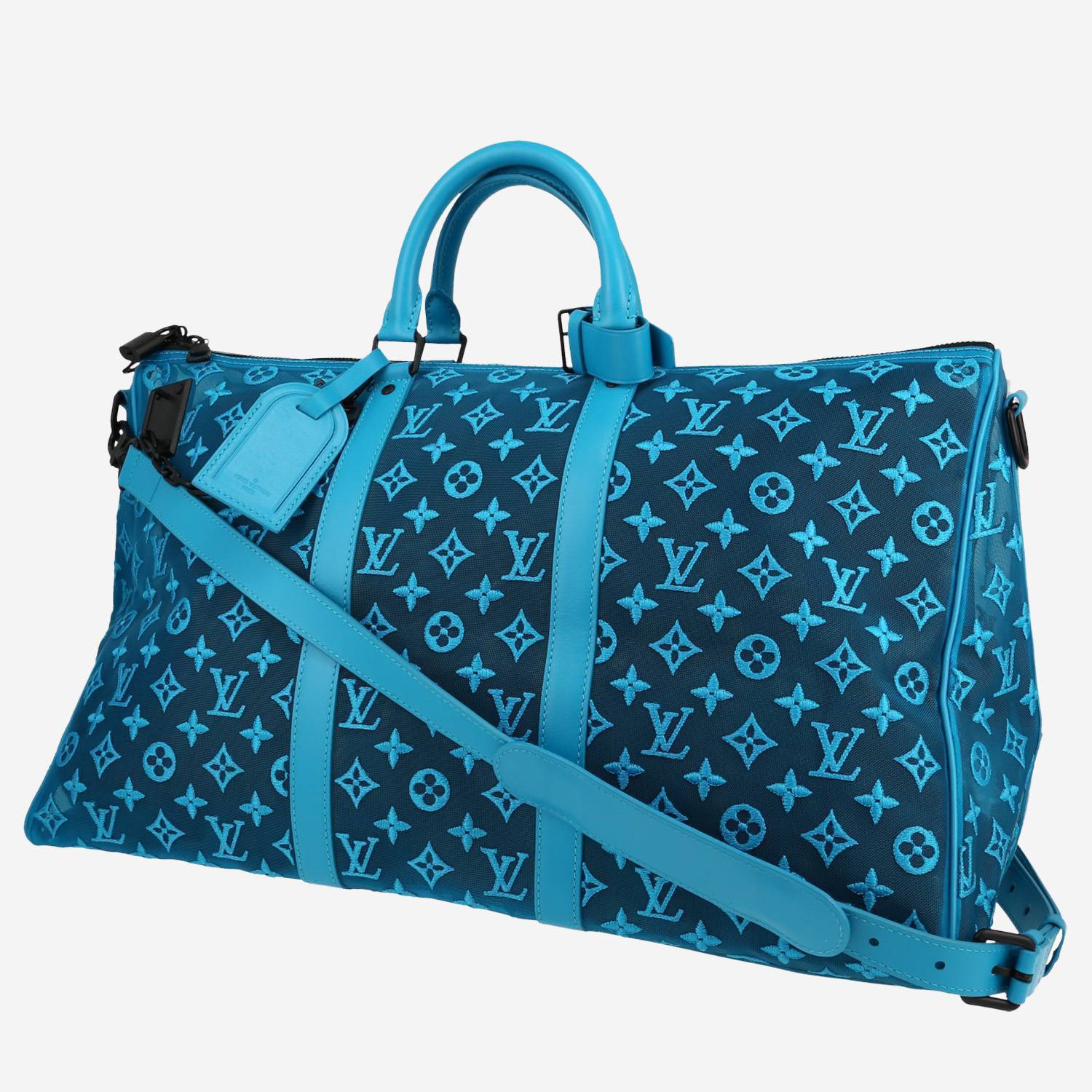 Superb Louis Vuitton Keepall Editions Limitées travel bag in blue mesh canvas, hardware in blackened metal, double handle in blue leather, one adjustable and removable shoulder strap in blue leather allowing the bag to be worn in the hand or on the shoulder or accross the body.