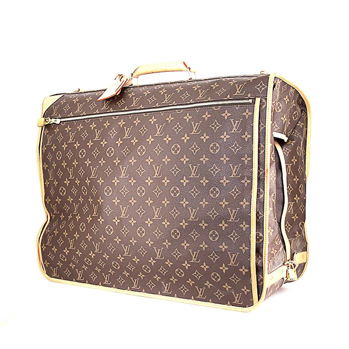 Elegant Louis Vuitton clothes-hangers in monogram canvas and natural leather, hardware in gilt metal, simple handle in natural leather, one strap in brown canvas allowing the bag to be worn in the hand or on the shoulder.