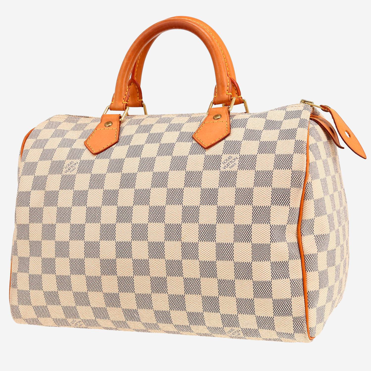 Timeless Louis Vuitton Speedy 30 handbag in azur damier canvas, hardware in gilt metal, double handle natural leather allowing the bag to be worn in the hand.