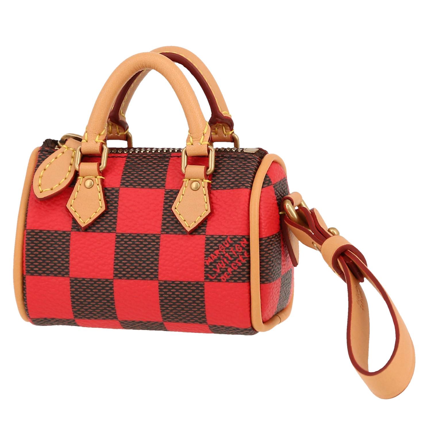 Surprising Louis Vuitton Speedy Editions Limitées key-ring in brown and red damier canvas, hardware in gilt metal, double handle natural leather allowing the bag to be worn in the hand.