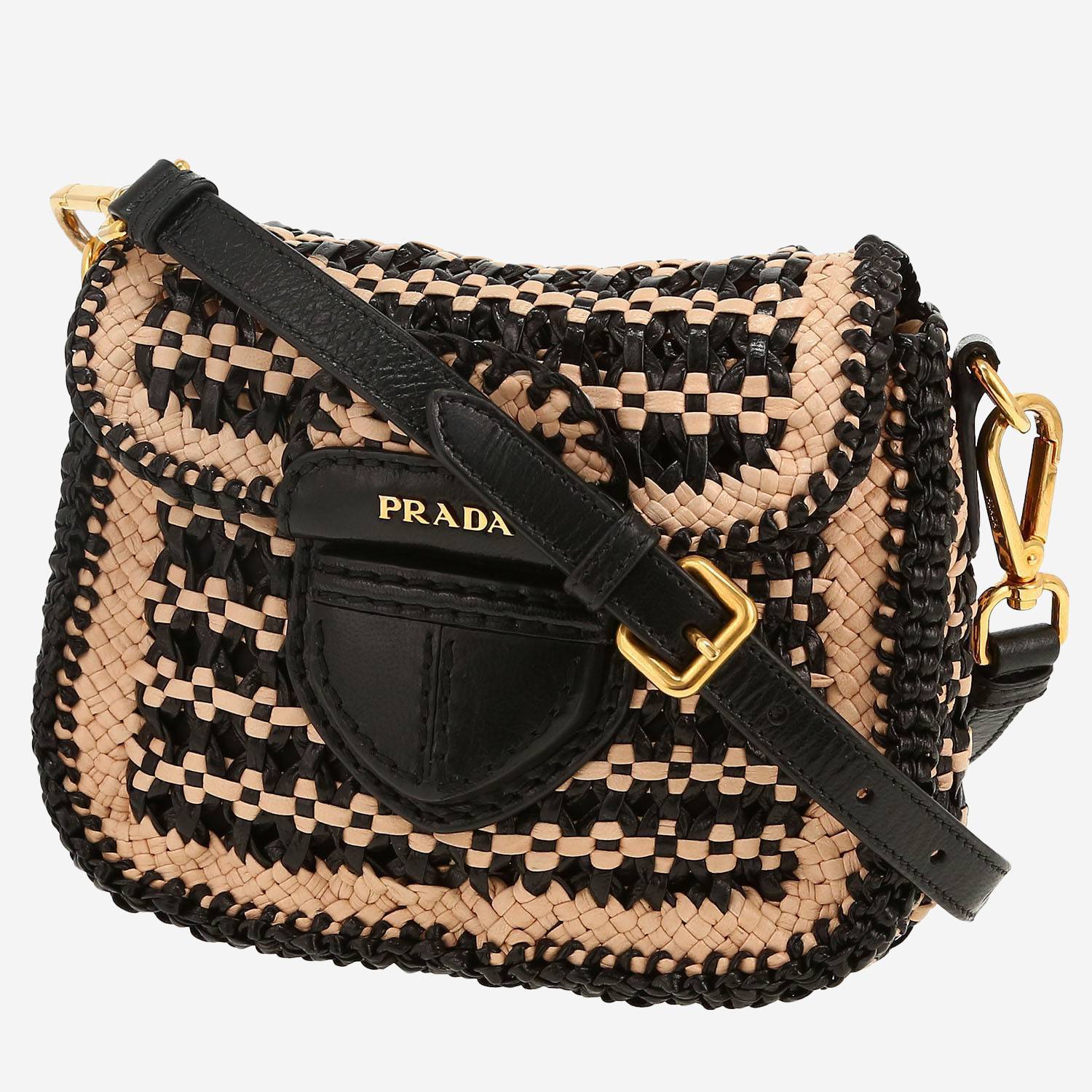 Surprising Prada Madras shoulder bag in beige and black braided leather, hardware in gilt metal, one adjustable and removable shoulder strap in black leather allowing the bag to be worn on the shoulder or accross the body.