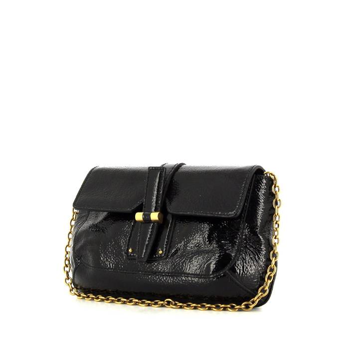 Chic small model Saint Laurent handbag in black patent leather, hardware in gilt metal, chain strap in gilt metal allowing the bag to be worn in the hand or on the shoulder.