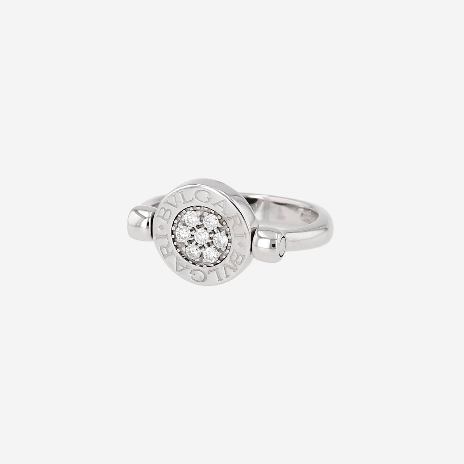 Twisted Bulgari Bulgari Bulgari ring in white gold, in diamonds, and in onyx, composed of one delicate round engraved disc in white gold delicately set with brilliant cut diamonds about 0.14 carat in total, decorated on the other side with one round plate in onyx.