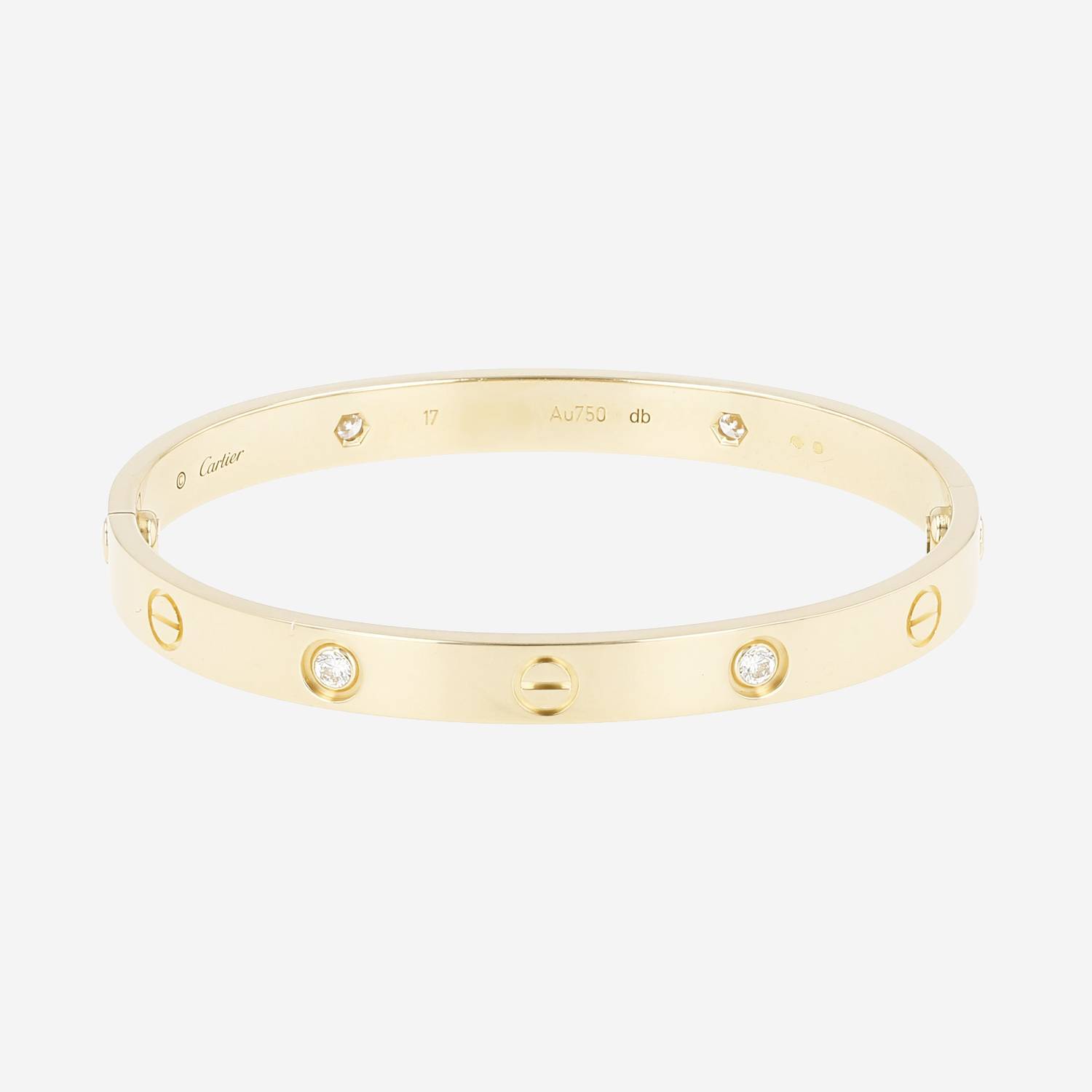 Cartier Love 4 diamants bracelet in yellow gold and diamonds, composed of one elegant smooth sleeve, decorated with of engraved screw patterns enhanced of brilliant cut diamonds.