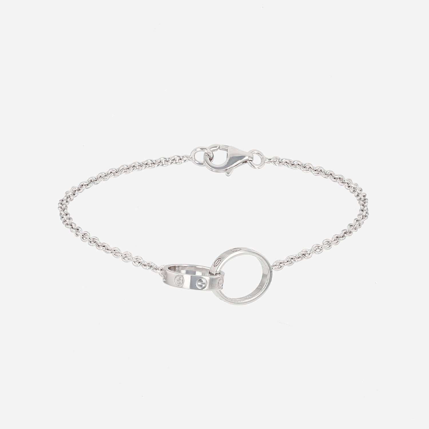 Cartier Love bracelet in white gold, composed of of elegant interwoven sleeves in white gold, decorated with of engraved screw patterns, hold by one in white gold forcat chain.