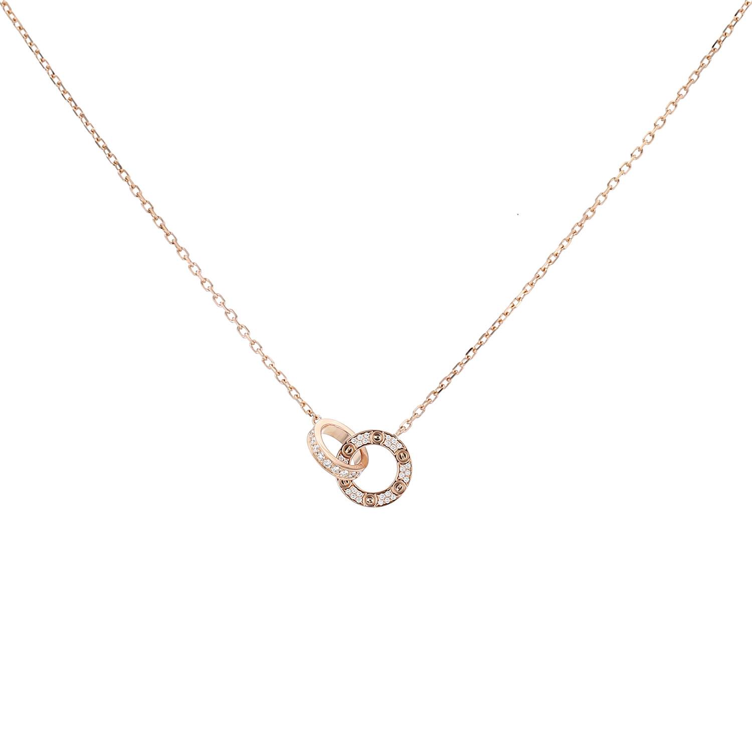 Cartier Love necklace in pink gold and diamonds, composed of of interwoven patterns in pink gold delicately set with of brilliant cut diamonds about 0.30 carat, decorated with of engraved screw patterns.
