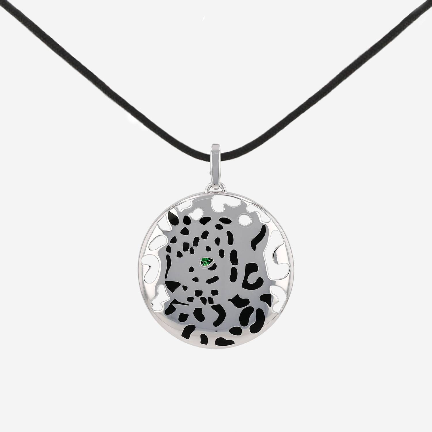 Cartier Panthère pendant in white gold, in lacquer black, and in tsavorites, composed of one round hemstitched setting in white gold, decorated with one panther black in lacquer enhanced one eye in tsavorites,.