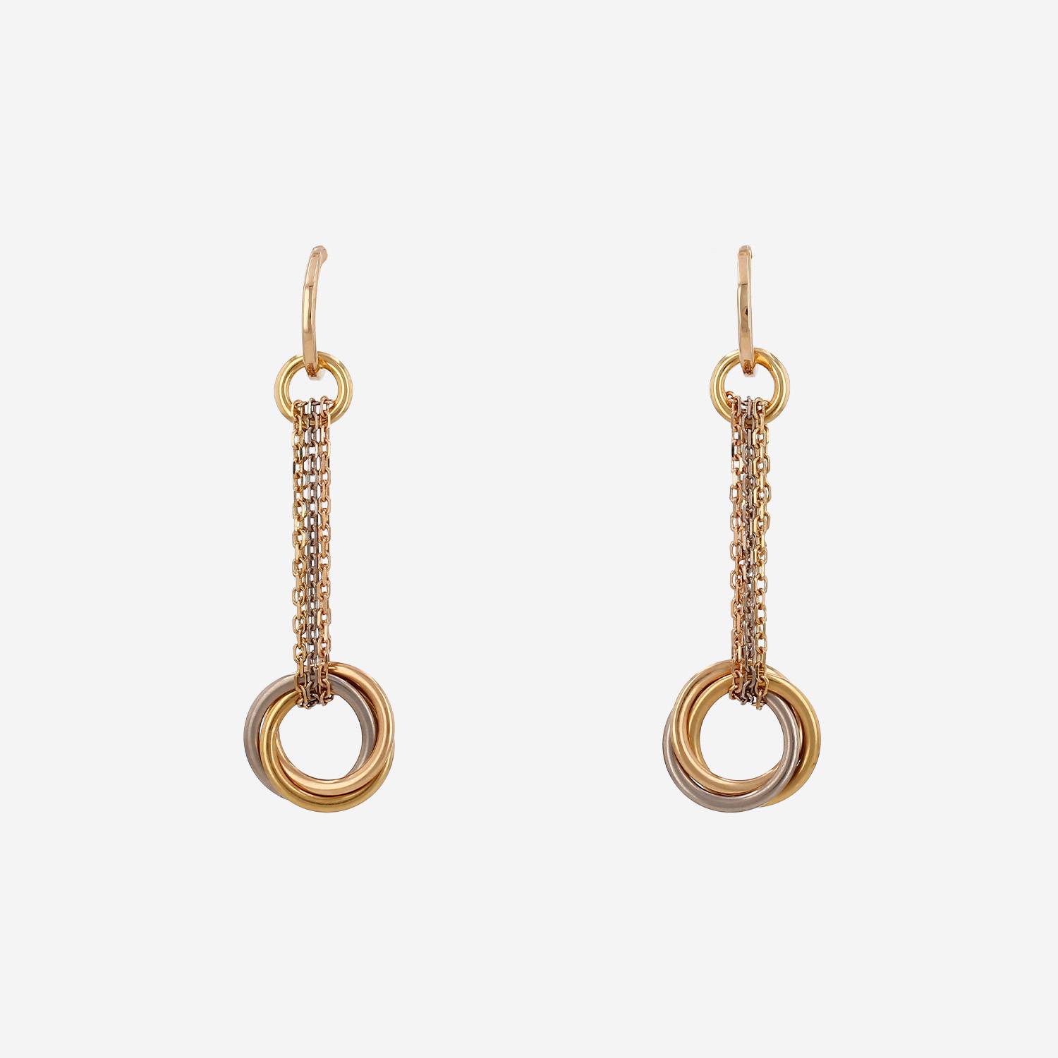 Cartier Trinity earrings in 3 golds, composed of of small rings in yellow gold, holding an overlapping of 3 interwoven rings in yellow gold on the drop beads, enhanced of delicate forcat chains in 3 golds.