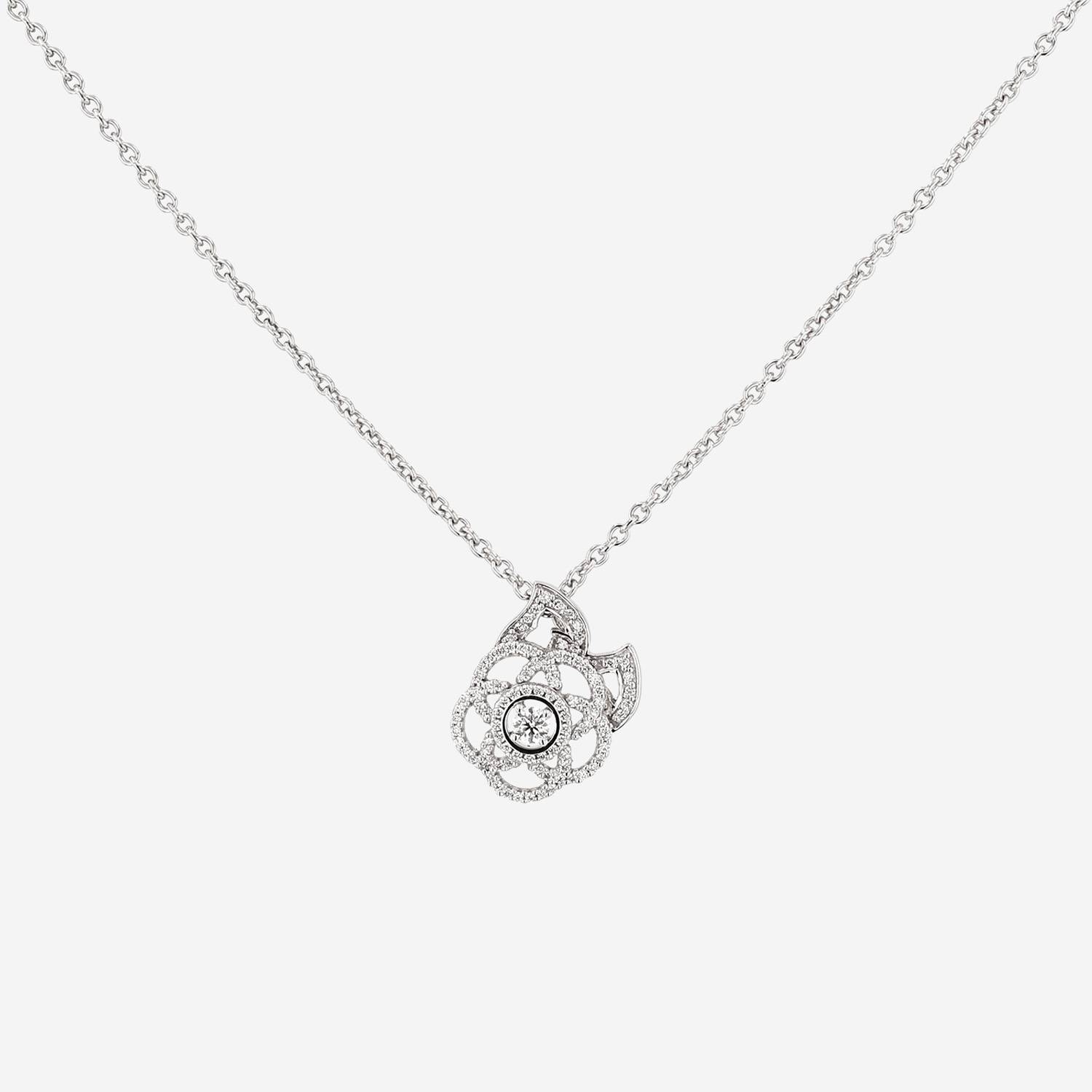 Chanel Camelia necklace in white gold and diamonds, including a lovely hemstitched camellia in white gold delicately set with of brilliant cut diamonds, decorated with one delicate small hemstitched leaf in white gold on a side set with of brilliant cut diamonds, enhanced one brilliant cut diamond about 0.10 carat on the center, hold by one in white gold chain.