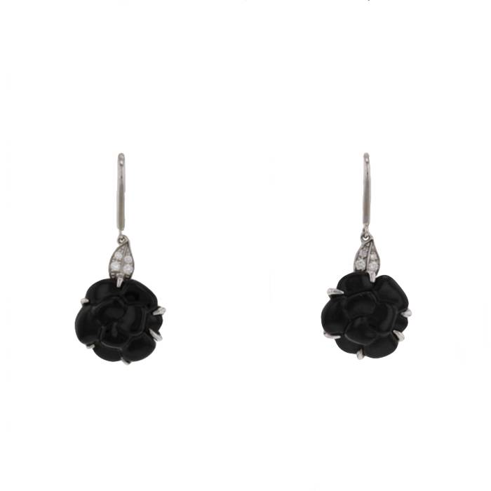 Chanel Camelia small model pendants earrings in white gold, onyx and diamonds Collector Square Ref: 32 81 60