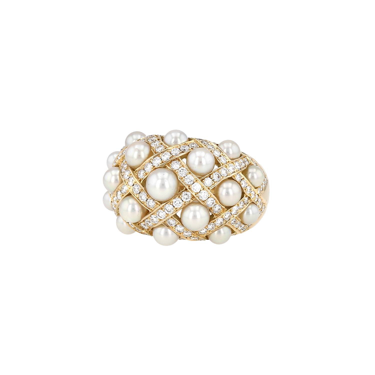 Chanel large model ring in yellow gold, in cultured pearls, and in diamonds, composed of one important setting in yellow gold delicately set with of brilliant cut diamonds about 0.85 carat, decorated with of cultured pearls.