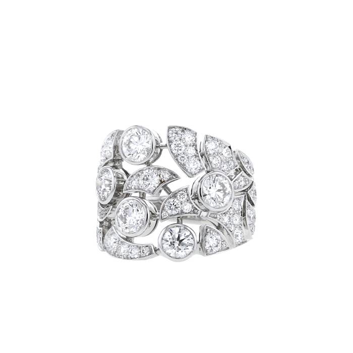 Exceptional and rare Chanel Lucienne ring in white gold diamonds, composed of one wonderful asymmetric hemstitched setting in white gold, decorated with one splendid geometric pattern completely paved with 71 brilliant cut diamonds (3,50 carats approx.).