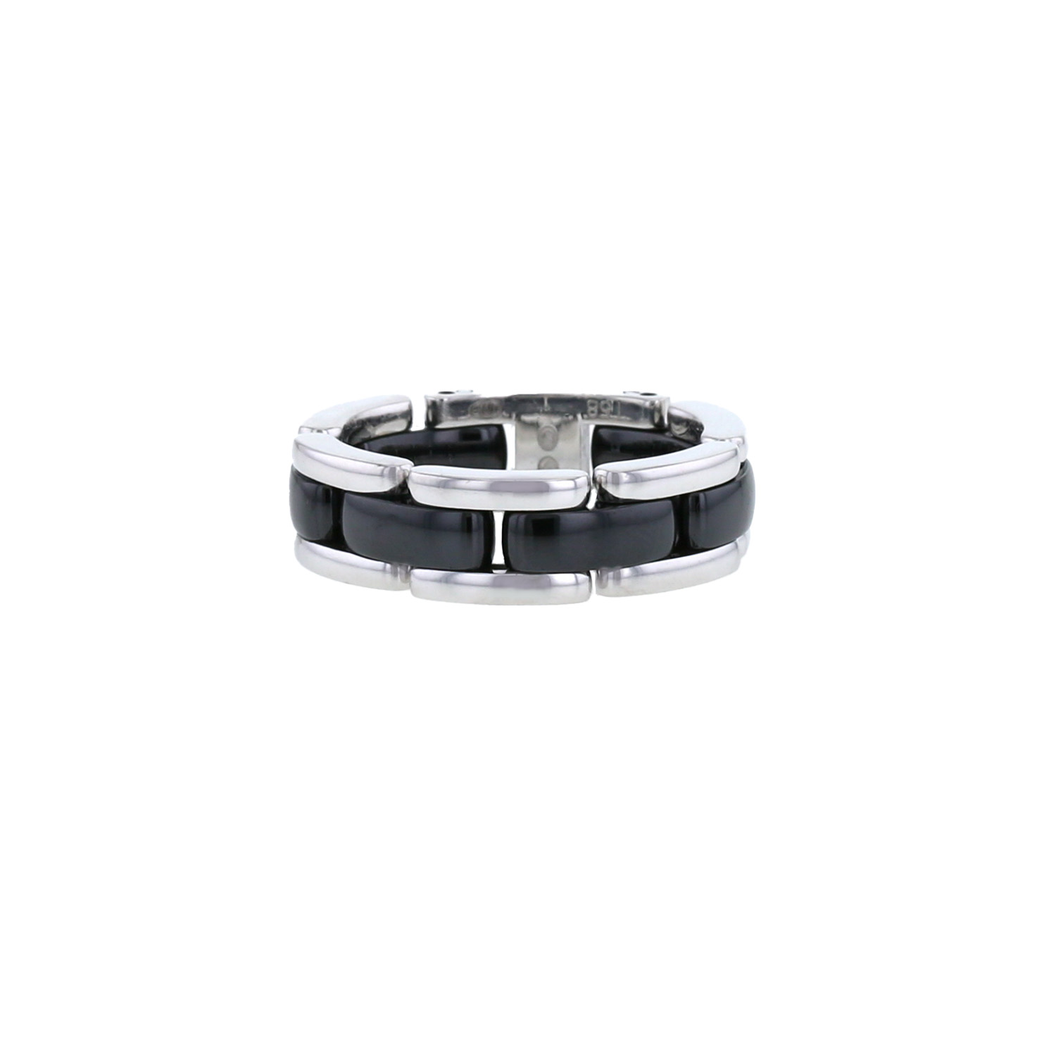 Flexible Chanel Ultra medium model ring in white gold and ceramic, composed of an alternating of delicate dome-shaped links black in ceramic, enhanced one very beautiful smooth setting in white gold.