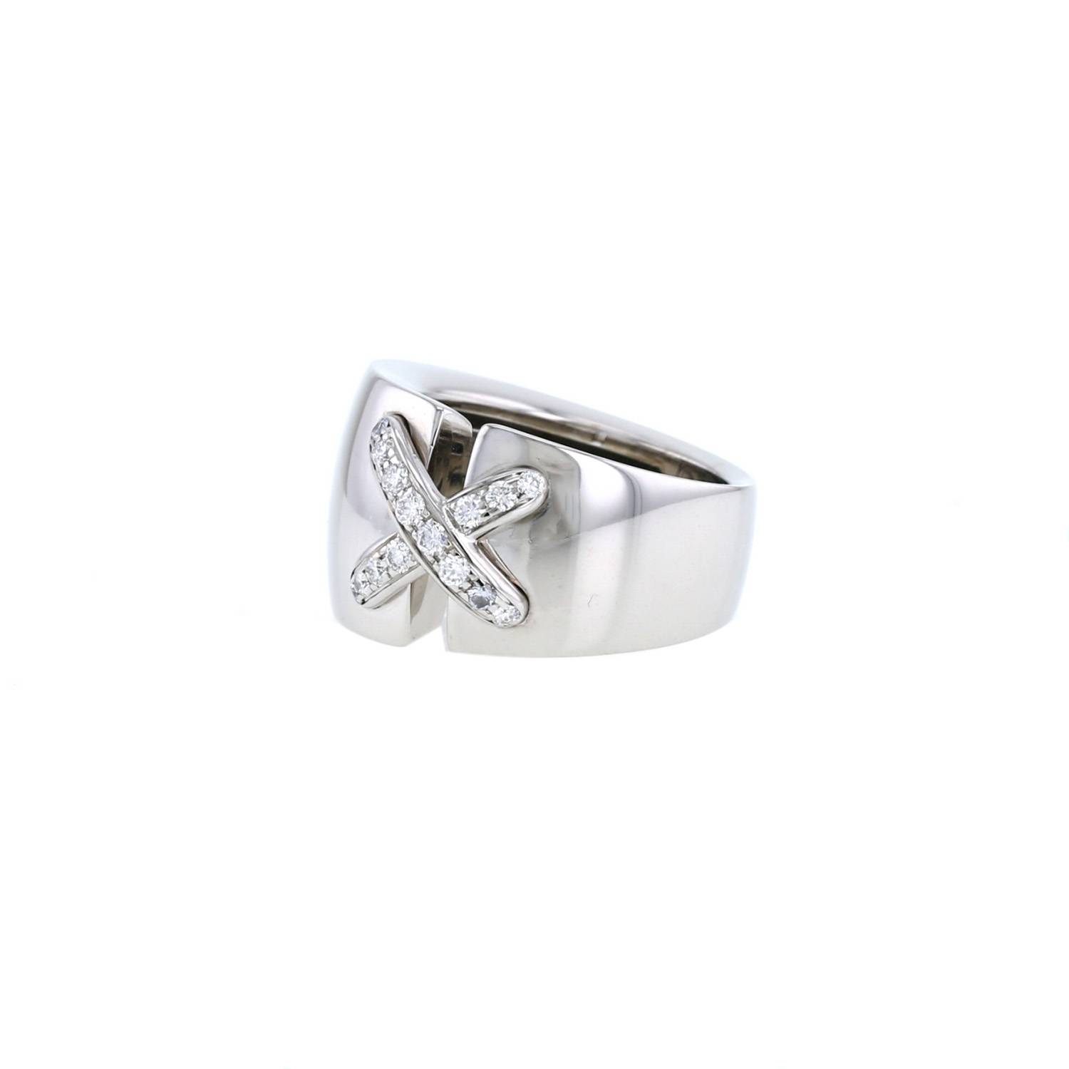 Chaumet Lien large model ring in white gold and diamonds, composed of one important dome-shaped open sleeve in white gold, decorated with one thin dome-shaped crossed link in white gold in its center delicately set with about 0,30 carat of brilliant cut diamonds.