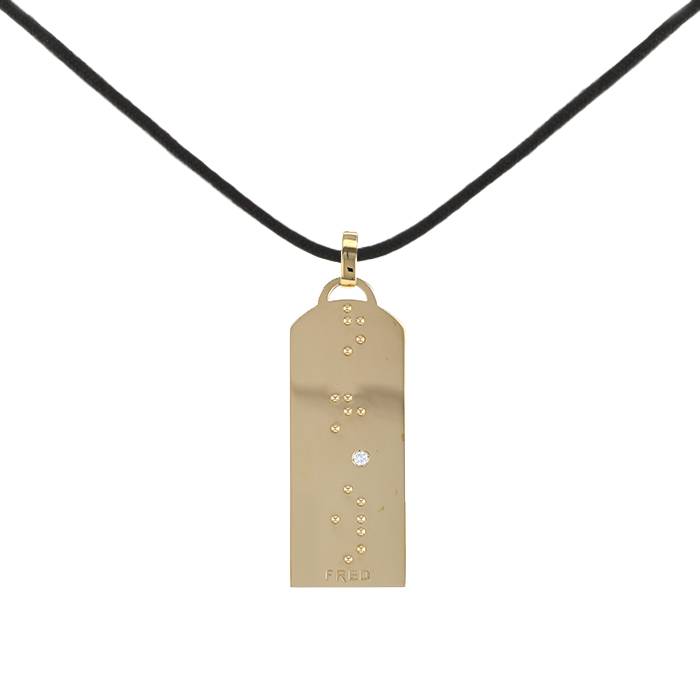 Original Fred pendant in yellow gold diamond, composed of one beautiful large smooth plate elegantly set with one brilliant cut diamond about 0.02 carat, enhanced with "Je T'aime" braille inscription.