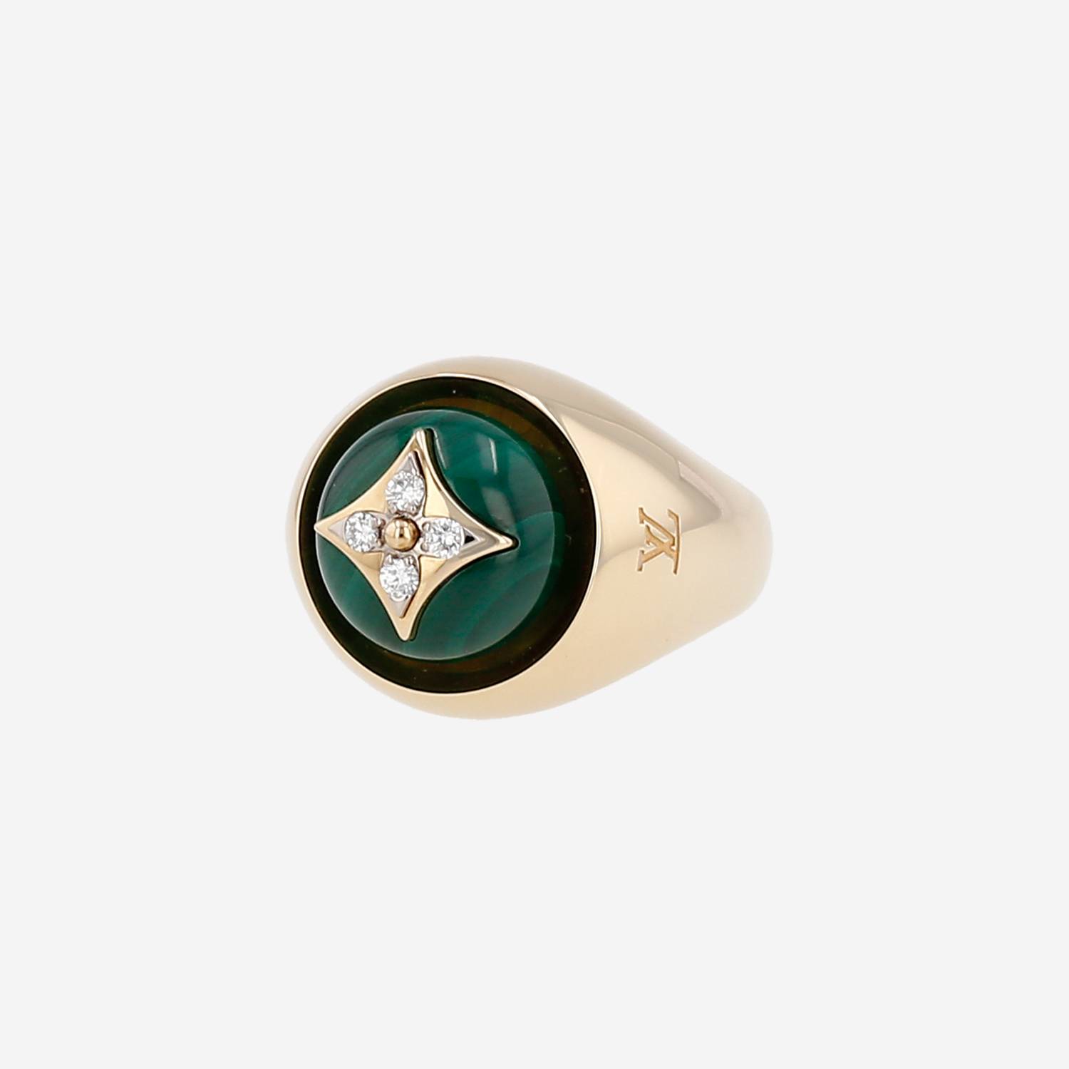 Louis Vuitton Color Blossom signet ring in yellow gold, in malachite, and in diamonds, composed of one important layered dome-shaped setting in yellow gold, decorated with one elegant pearl in malachite enhanced one star in yellow gold set with of brilliant cut diamonds.