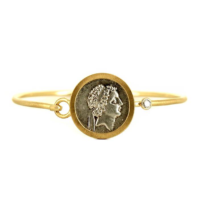 Opening Maison Auclert bangle in mat yellow gold set with a silver hellenistic drachma from Cappadocia of the 1st century BC (King Ariarathès III), and a 0.10 carat diamond.