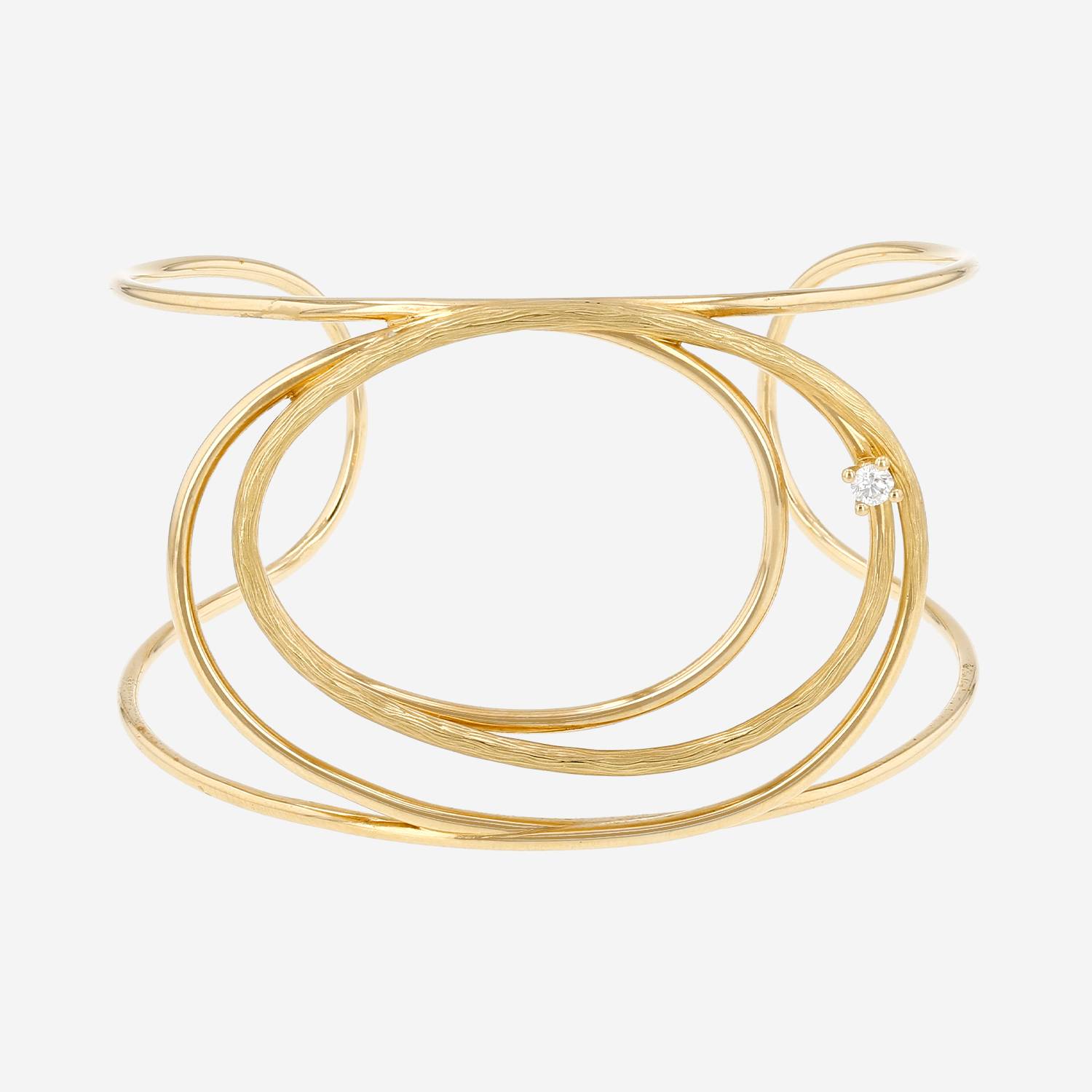 Mellerio Riviera cuff bracelet in yellow gold and diamond, composed of one important hemstitched setting in yellow gold, enhanced one brilliant cut diamond about 0.08 carat.