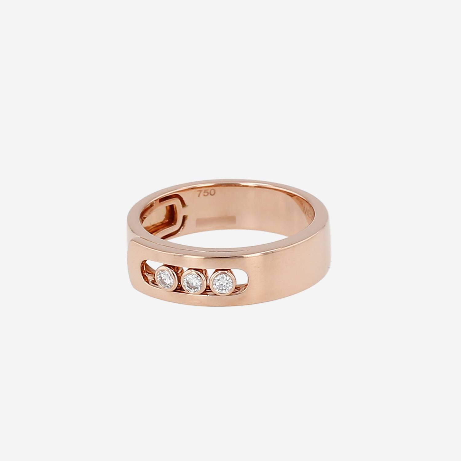 Messika Move Noa ring in pink gold and diamonds, composed of one elegant hemstitched sleeve in pink gold, holding 3 delicate mobile brilliant cut diamonds weighting a total of 0.10 carat in its center.