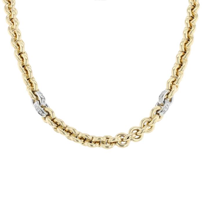 Vintage necklace in yellow gold, in platinium, and in diamonds, composed of one very beautiful round link chain in yellow gold, enhanced of links in platinium elegantly set with of brilliant cut diamonds about 1 carat.