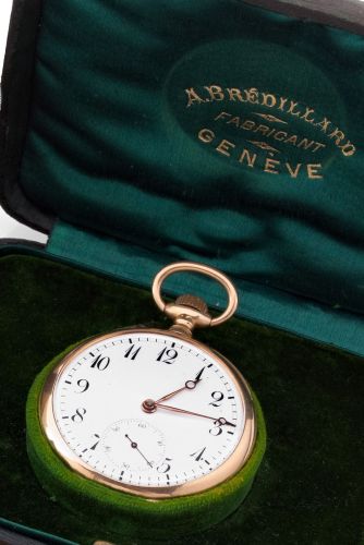 Description : N° 9408 vers 1900 Belle montre de poche en or rose. Cadran émail blanc avec chiffres arabes peints, petite trotteuse à 6 heures, aiguilles Breguet or rose. Mouvement mécanique à échappement à ancre. Boîtier signé. Diamètre: 47 mm. Poids brut 73,6gr. Vendue avec son écrin et son certificat d'origine. A FINE 18K PINK GOLD MANUAL WINDING POCKET WATCH WITH ORIGINAL BOX AND CERTIFICATRead our expert's descriptionA.BREDILLARD