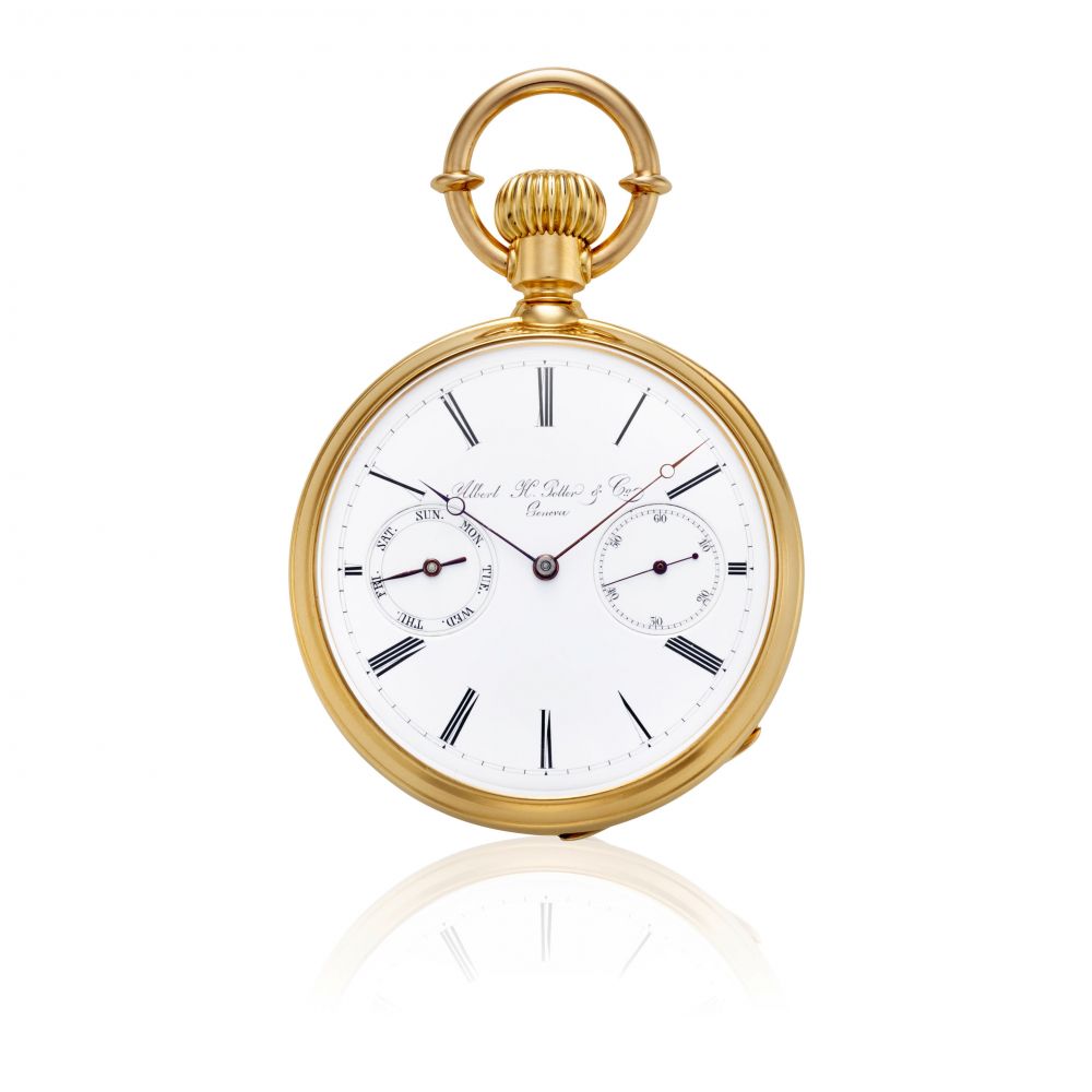 Log in to consult the next resultsRead our expert's descriptionAlbert H. Potter & Co, Geneva, No. 1, made circa 1887. Exceptional, highly important and unique 18K gold keyless watch with regulator dial, special winding/setting system, special plate construction and special single-tooth escape wheel lever escapement.