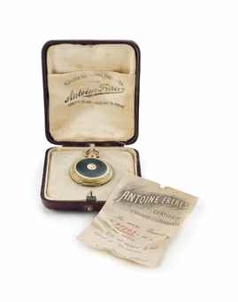 Description : Antoine Frères. An 18k Gold, Enamel and Diamond-set Openface Keyless Lever Pendant Watch with Original Certificate of Origin and Presentation Box.Signed Antoine Frères, No. 87'802, Circa 1910.Mechanical gilt-finished jewelled lever movement, silvered guilloché, polished chapter ring with Breguet numerals, subsidiary seconds, circular case, translucent grey enamel dial back, white enamel border, diamond-set center with white enamel border, engraved geometric motif to the rims and band, cuvette, dial and movement signed.27.5mm diam.Read our expert's descriptionAntoine Frères