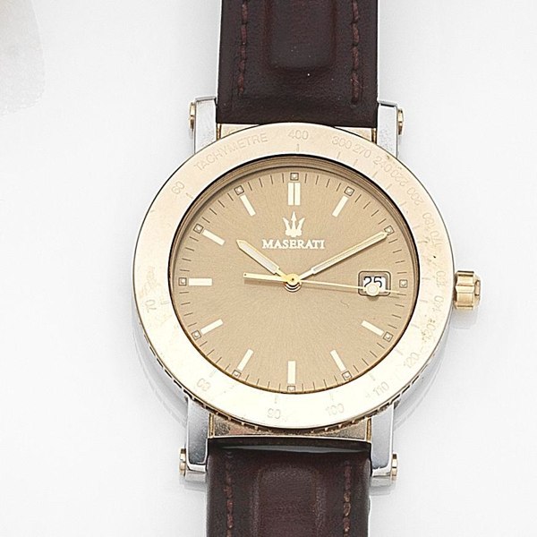 Description : Ghibli, Case No.16931, Circa 1995 7-jewel ETA Cal.955 414 quartz movement, sunburst champagne dial with gilt baton hour markers, black outer minute divisions with luminous dot five minute markers, gilt pointed baton hands with luminous inserts and lollipop centre seconds, date aperture at 3, polished round case with snap on back, gilt bezel with tachymeter scale, gilt signed crown, fitted brown leather strap and signed folding clasp, together with fitted Maserati box, instruction booklet and blank guarantee card, case and dial signed.36mm.Read our expert's descriptionMaserati. A stainless steel quartz calendar wristwatch with box and papers