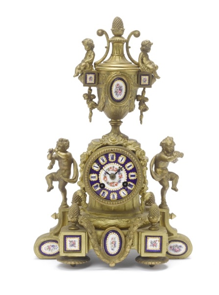Description : Henry Marc, Paris The ornate case with two winged cherubs holding a cloth over a pair of doves on a shaped plinth with blue porcelain musically themed panels on a separate scrolling giltwood base, the 3.5-inch signed dial with blue Roman numerals and gilt brass hands to the twin barrel movement with anchor escapement and external countwheel striking on a bell 34cm (13.5in) high.Read our expert's descriptionA late 19th century porcelain panelled gilt-brass figural mantel clock