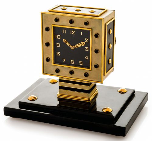 Description : C. Square overlaid with ivory-colored lacquer, the sides and top with yellow gold-edged panels of.black lacquer each set with three yellow gold domed studs, yellow gold-edged front with yellow.gold bezel surrounded by 12 black onyx cabochons in yellow gold settings, hinged back door.square column alternating black and ivory-colored lacquer stripes and gold lines, yellow gold.line mount at the base, rectangular stepped black lacquered silver base set with four large yellow.gold domed studs, matte silver-gilt interior clock housing..D. Matte black with applied yellow gold Arabic numerals. Pierced yellow gold Art-Deco hands..M. 19```, rhodium plated, fausses cotes decoration, 15 jewels, straight line lever escapement, cut.bimetallic compensation balance with 3 adjustments, Breguet balance spring, index regulator.Read our expert's descriptionLACLOCHE FRERES - SILVER & GOLD ART DECO CLOCK.Lacloche Frères, No. 874/1034. The case with London import marks for 1929-30..Fine and very rare, Art-Deco, lacquered silver, yellow gold and onyx-set, 8-day going table clock.