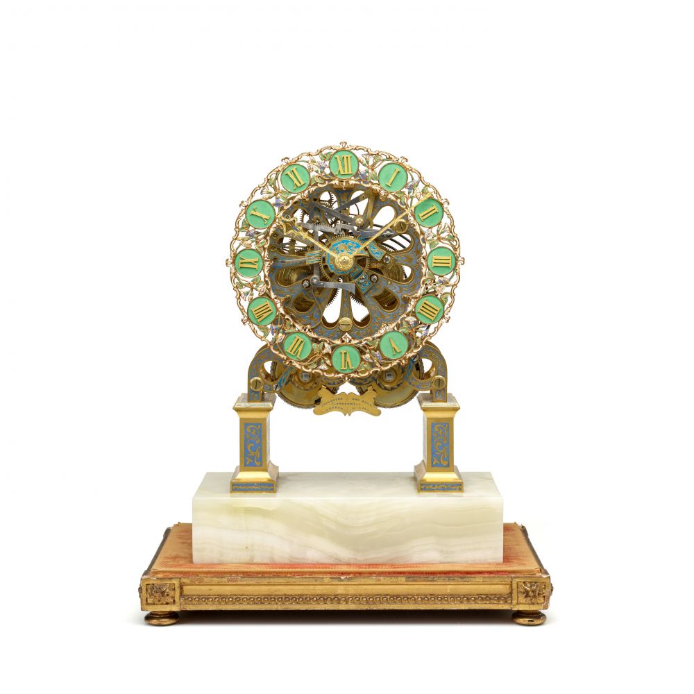 Description : John Moore and Sons, Clerkenwell, London, no. 12852,Date: Circa 1851,Movement: On rectangular onyx base, pierced rosette plates joined by five tapered baluster pillars raised on plinth supports inlaid overall with blue champlevé enamel and engraved brass foliate scrollwork, gilt platform lever escapement, gold three arm balance, twin chain fusees, maintaining power, quarter striking on two coiled gongs,Dial: Chapter ring pierced with enameled flowers and scrolls between applied engraved gilt roman numerals on green enamel reserves, engraved gilt hands,Signed: On shaped plaque below frame,Size: 13 ¾ in (35cm) high,Accompaniments: Giltwood standRead our expert's descriptionA FINE GREAT EXHIBITION CHAMPLEVÉ ENAMEL QUARTER STRIKING SKELETON CLOCK