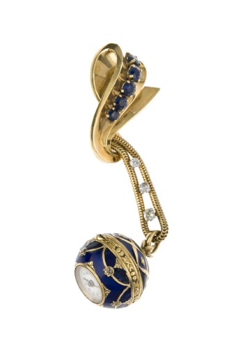 Description :N°82053 vers 1880 Belle montre boule en or émaillée bleue (Restaurations). Cadran émail, aiguilles or. Mouvement mécanique à réviser. Cordonnet en or souligné de trois diamants. Broche en or soulignée de cinq saphirs. Vendue dans son écrin LAFOREST. Diamètre: 20 mm. Poids brut: 29,5g AN ENAMELED BALL PENDANT WATCH