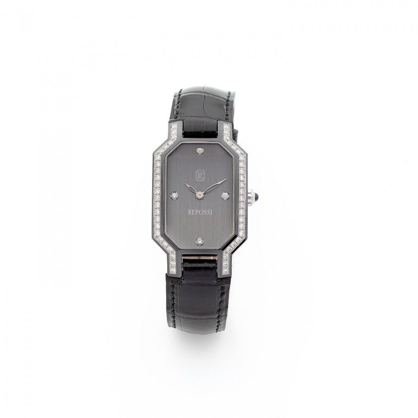 Description : REPOSSI REF. R2SQ,VERS 2000,Montre bracelet en acier noirci et diamants,BOÎTIER: rectangulaire à pans coupés, serti d'une ligne de diamants de chaque côté, fond fermeture à vis,CADRAN: gris avec index diamants,MOUVEMENT: quartz,BOUCLE: ardillon en acier, siglée,Signée et numérotée 913,DIM.: 25 x 31 mm (sans les attaches),A black stainless steel with diamond quartz wristwatch, with steel branded buckle,RAPPORT DE CONDITION,Conformément à nos conditions générales de vente, veuillez noter que le lot est vendu dans l'état où il se trouve au moment de la vente. Le rapport de condition est uniquement à titre indicatif et ne peut se substituer à votre appréciation personnelle. Le rapport de condition est une description subjective effectuée par Artcurial, le lot peut contenir d'autres défauts non mentionnés ou non visibles sur les images en ligne.,A la rédaction du catalogue le mouvement fonctionne. Veuillez noter que la précision de chronométrie n'est pas garantie et Artcurial ne pourra être tenu responsable des éventuels coûts de réparation.,Nous avertissons nos potentiels acquéreurs que les bracelets réalisés en derme d'espèces protégées sont présentés mais non vendus avec les montres. Artcurial se réserve le droit d'enlever ces bracelets en cas d'importation.,Bon état général avec traces d'usage,Un choc sur le boîtier à 1 h,Micro-rayures d'usage sur le fond du boîtier,CONDITION REPORT,In accordance with our terms and conditions of sale, please note that the lot is sold as it is at the time of sale. The condition report is for information purposes only and is not a substitute for your personal assessment. The condition report is a subjective description made by Artcurial, the lot may contain other defects not mentioned or not visible on the images online.,At the time of cataloguing the movement is running. Please note that the movement has not been checked for timekeeping accuracy and Artcurial will not be held responsible for any repairs should they be required.,Please be advised that straps made of material derived from endangered or otherwise protected species (ie. Alligator and crocodile) are not sold with the watches and are for display purposes only. We reserve the right to remove these straps prior to shipping.,Good general condition with trace of use,One shock on the case at 1 o'clock,Micro-scratches from use on the casebackRead our expert's descriptionREPOSSI REF. R2SQ,VERS 2000