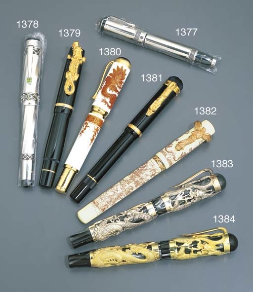 Description : Lot Description.VISCONTI. A LIMITED EDITION 18K PINK GOLD AND CELLULOID FOUNTAIN PEN.Signed Visconti, La Divina Comedia, No. 06/88, 2002.The hand engraved ivory celluloid pen depicting Dante's journey into Hell and Purgatory in fine detail, the cap with clip in the form of an pink gold angel, the barrel enhanced by a ring of delicate pink gold ornaments, with 18k gold nib.14.3 cm. long.Special Notice.This lot has no reserve.View Lot Notes ›Read our expert's descriptionVISCONTI. A LIMITED EDITION 18K PINK GOLD AND CELLULOID FOUNTAIN PEN