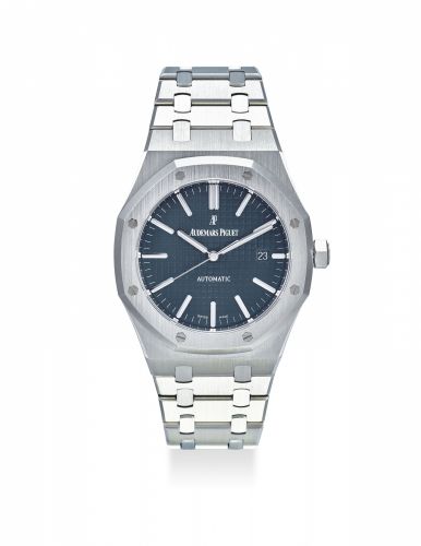Description : AUDEMARS PIGUET. A VERY FINE STAINLESS STEEL AUTOMATIC WRISTWATCH WITH SWEEP CENTRE SECONDS, DATE, BRACELET, INTERNATIONAL GUARANTEE AND BOX;SIGNED AUDEMARS PIGUET, GENEVE, ROYAL OAK MODEL, REF. 15400ST.OO.1220ST.01, MOVEMENT NO. 943’912, CASE NO. I81221-11969, CIRCA 2015;Movement: cal. 3120, automatic, 40 jewels, signed;Dial: signed;Case: screw back, 41 mm. diam., signed;With: stainless steel Audemars Piguet bracelet with deployant clasp stamped 1220, overall length of approx. 185 mm. International Guarantee stamped by Swiss retailer Les Ambassadeurs and dated 31 July 2015, product literature and presentation box.Read our expert's descriptionAUDEMARS PIGUET. A VERY FINE STAINLESS STEEL AUTOMATIC WRISTWATCH WITH SWEEP CENTRE SECONDS, DATE, BRACELET, INTERNATIONAL GUARANTEE AND BOX
