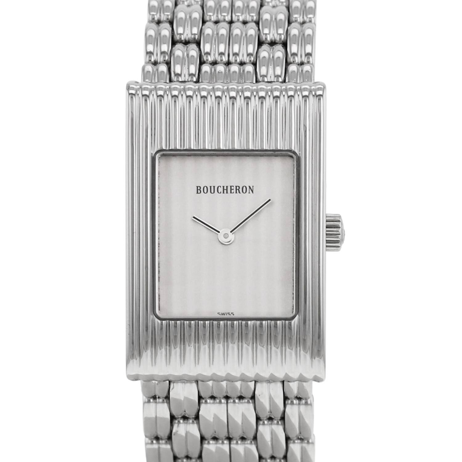 Stainless steel Boucheron Reflet wristwatch. Rectangular case in stainless steel with godron, screwed caseback, canned crown.