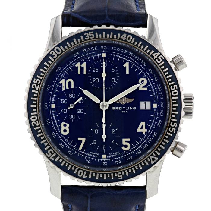 - Blue leather bracelet, ardillon buckle in stainless steel signed Breitling.