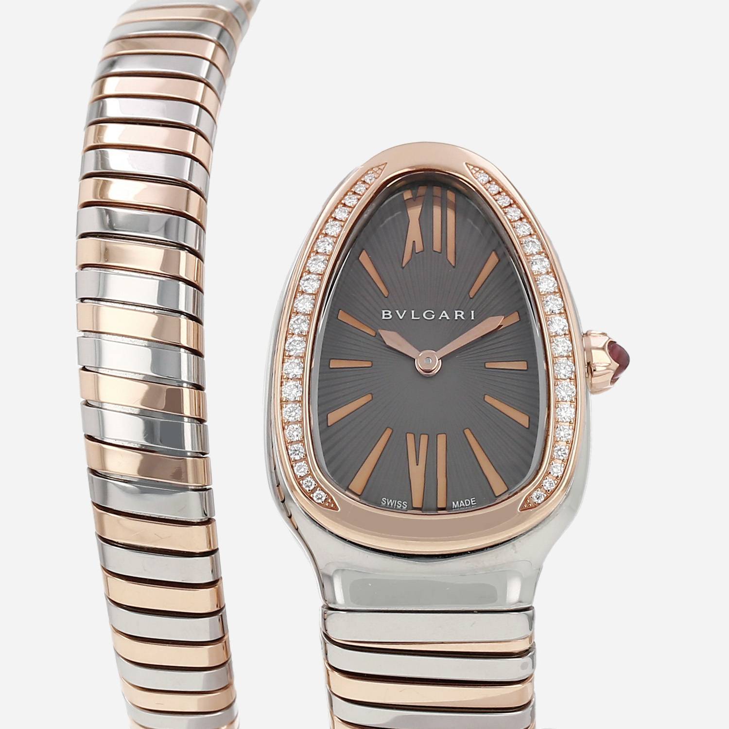 Rose Gold and stainless steel Bulgari Serpenti wristwatch. Oval case in gold and stainless steel, screwed caseback, pink gold bezel with diamonds, crown set with a cabochon.