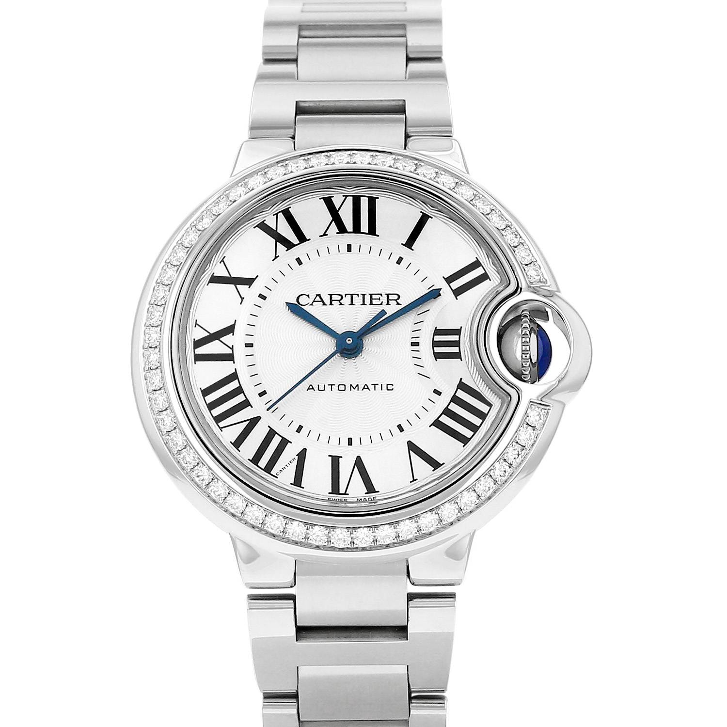 Stainless steel Cartier Ballon Bleu De Cartier wristwatch. Round case in stainless steel, screwed caseback, bezel with diamonds, crown protection.