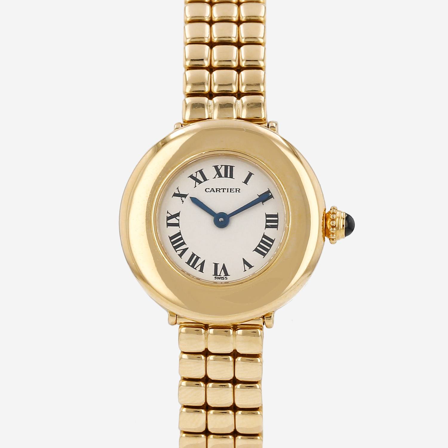 Yellow gold Cartier Colisee wristwatch. Round case in yellow gold, screwed caseback, canned crown set with a sapphire cabochon.