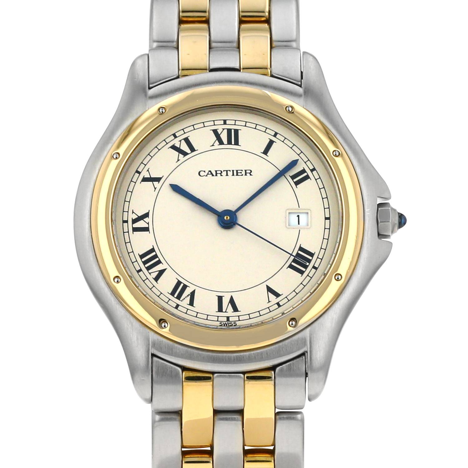 Gold and stainless steel Cartier Cougar wristwatch. Round case in gold and stainless steel, screwed caseback, yellow gold screwed bezel, canned crown set with a sapphire cabochon.