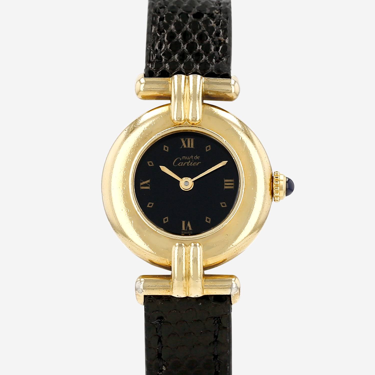 Vermeil Cartier Must Colisée watch. Round case in vermeil, screwed caseback, crown set with a sapphire cabochon.