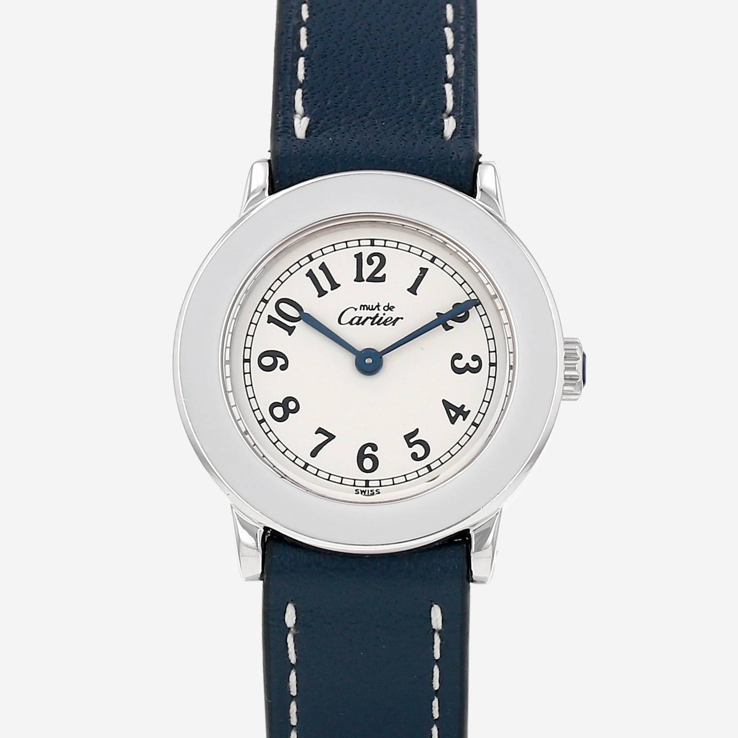 Silver Cartier Must II wristwatch. Round case in silver, screwed caseback, canned crown set with a sapphire cabochon.