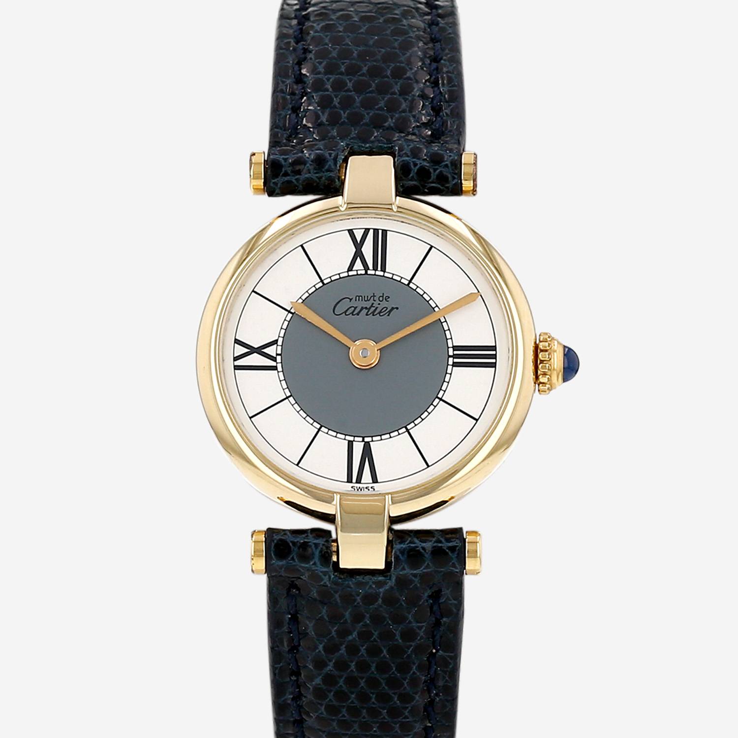 Vermeil Cartier Must Vendôme wristwatch. Round case in vermeil, clipped caseback, canned crown set with a sapphire cabochon.