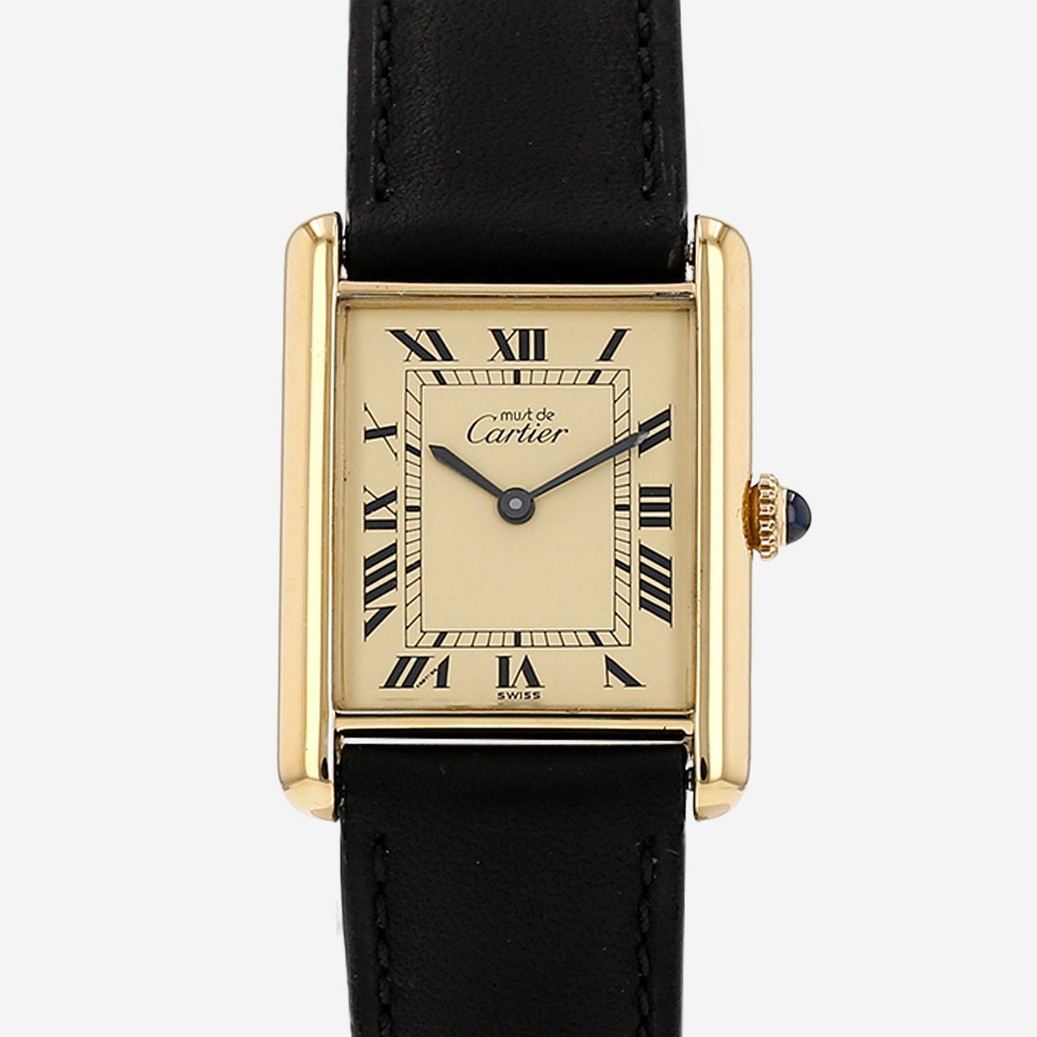 Vermeil Cartier Tank Must wristwatch. Rectangular case in vermeil, screwed caseback, canned crown set with a sapphire cabochon.