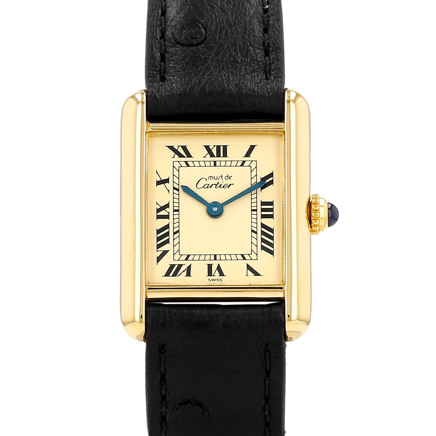 Vermeil Cartier Tank Must wristwatch. Rectangular case in vermeil, screwed caseback, canned crown set with a sapphire cabochon.