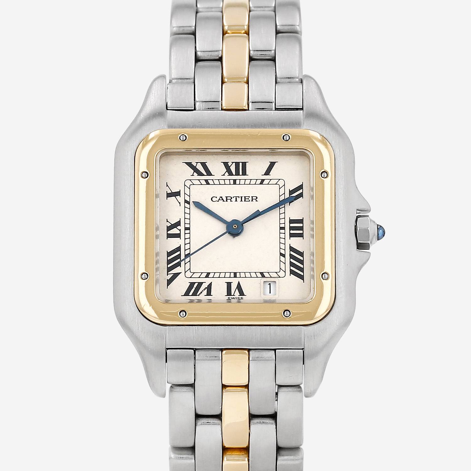 Gold and stainless steel Cartier Panthère wristwatch. Square case in gold and stainless steel, screwed caseback, yellow gold screwed bezel, crown set with a sapphire cabochon.