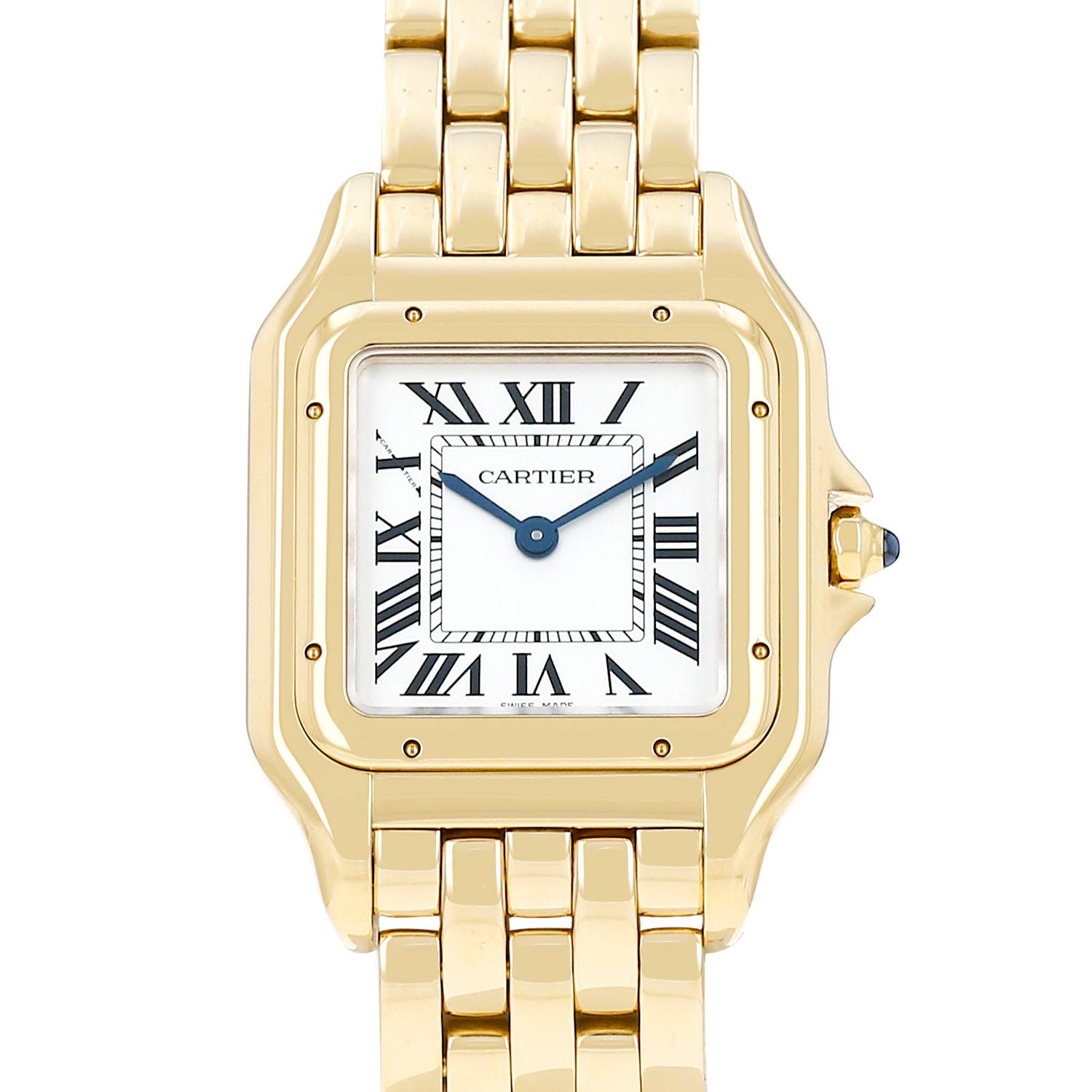 Yellow gold Cartier Panthère wristwatch. Square case in yellow gold, screwed caseback, yellow gold screwed bezel, crown set with a sapphire cabochon.