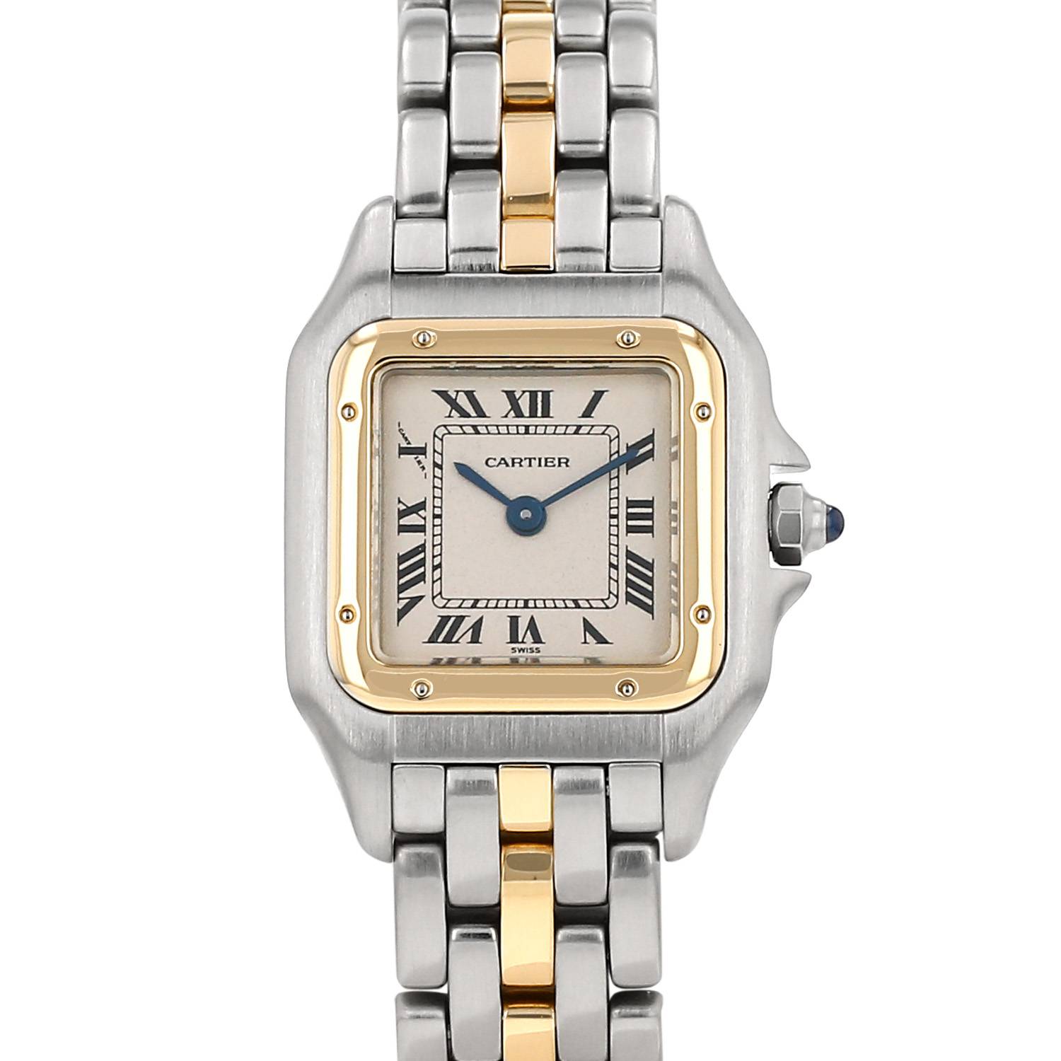 Gold and stainless steel Cartier Panthère wristwatch small model. Square case in gold and stainless steel, screwed caseback, yellow gold screwed bezel, canned crown set with a sapphire cabochon.