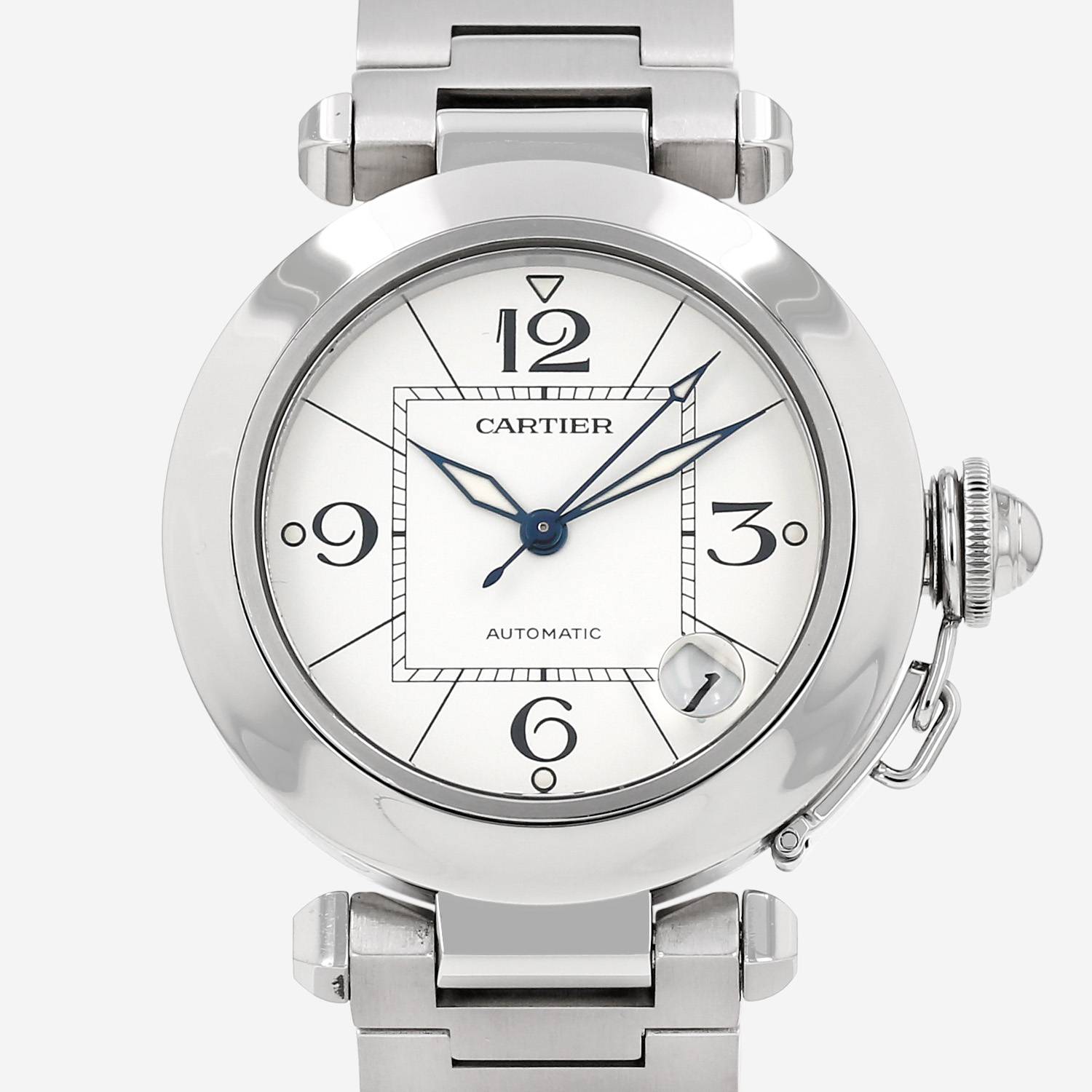 Stainless steel Cartier Pasha wristwatch. Round case in stainless steel, screwed caseback, screwed crown protection.